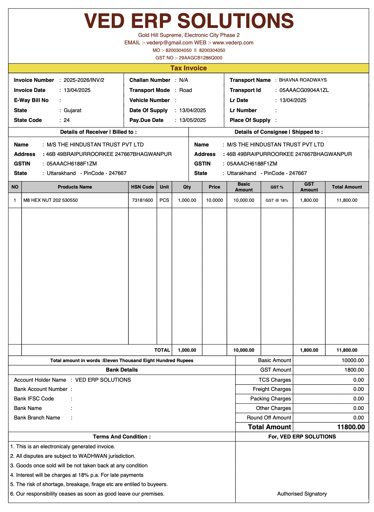 With simplified GST invoice formats, you can file all your GST returns using Ved ERP with one click, we help you all GST compliance reports.